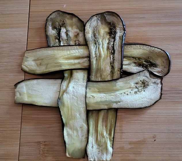 - Lavare le melanzane e tagliarle a strisce sottili nel senso della lunghezza.