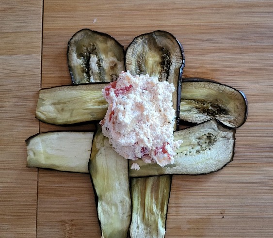 - Stendere ad incrocio 4 strisce di melanzane grigliate, come da foto. Mettere al centro una generosa cucchiaiata di ripieno e chiudere a pacchetto, tirando su prima i due lembi orizzontali e poi quelli verticali.