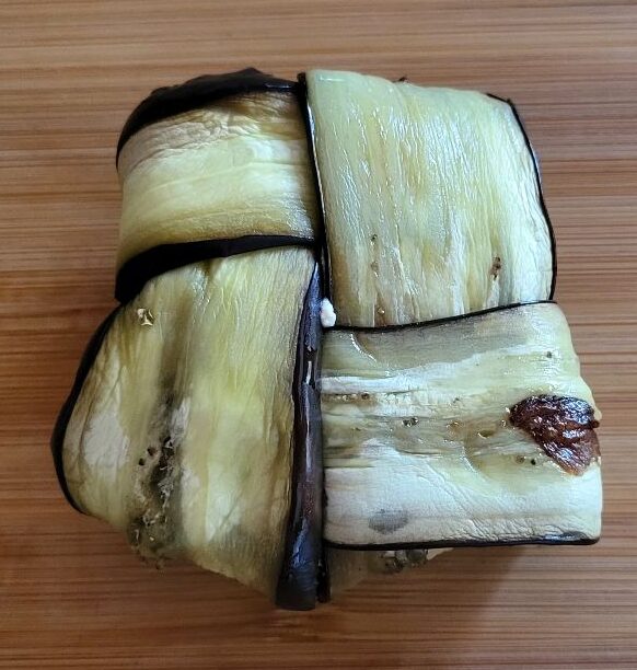 - Stendere ad incrocio 4 strisce di melanzane grigliate, come da foto. Mettere al centro una generosa cucchiaiata di ripieno e chiudere a pacchetto, tirando su prima i due lembi orizzontali e poi quelli verticali.