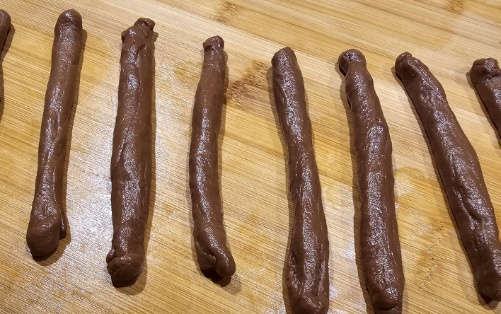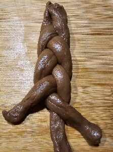 Dividere ancora ogni pezzo in tre parti e realizzare con ogni pezzo un salsicciotto di 18/20 cm di lunghezza. Intrecciare i tre salsicciotti per realizzare una treccina (come nella foto).
