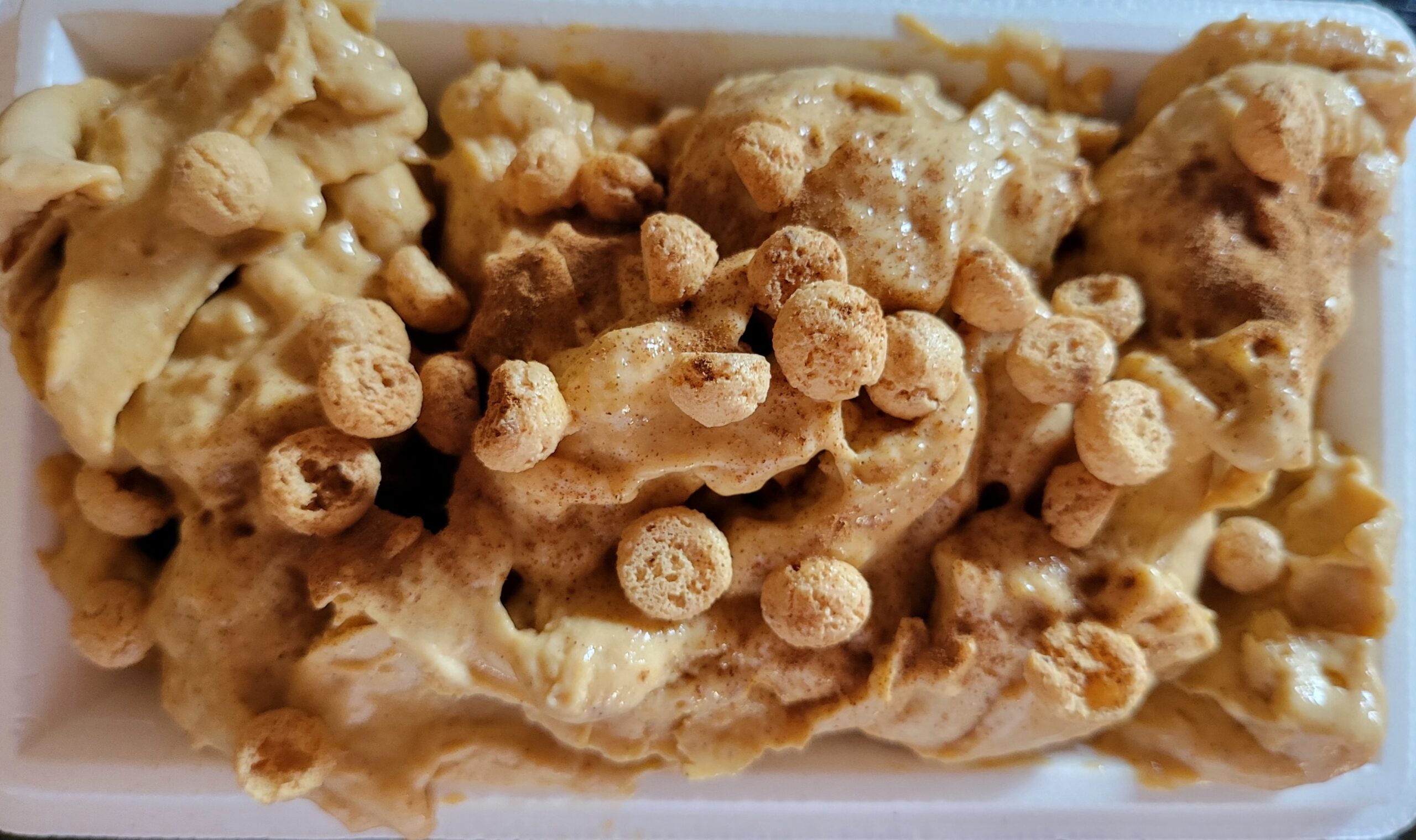 Adagiare il gelato pronto in una vaschetta adatta al freezer e completare con amaretti e cannella.
